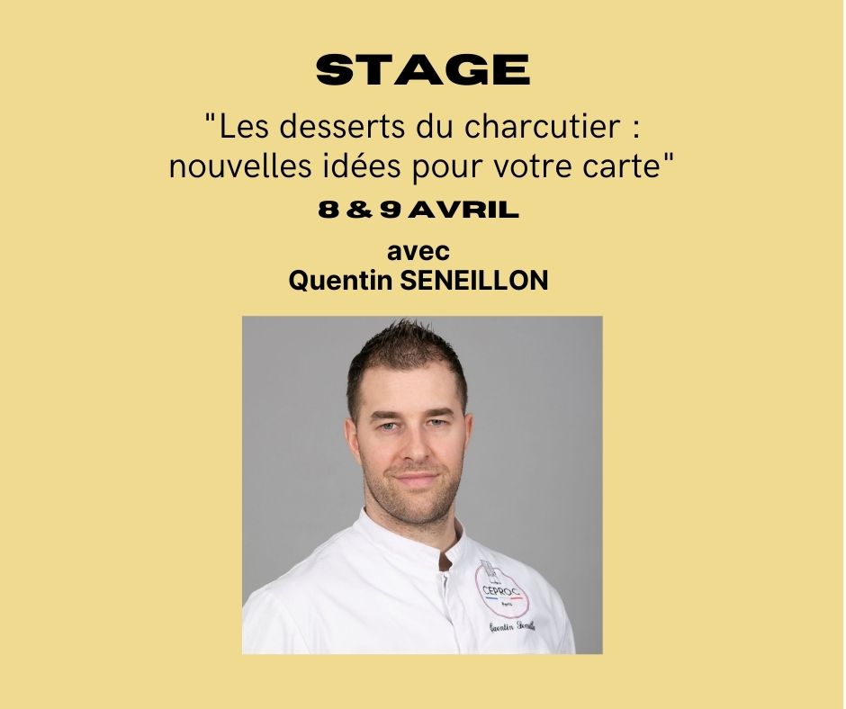 Nous sommes heureux de vous proposer le stage « les desserts du charcutier » animé par Quentin Seneillon les 8 et 9 avril au CEPROC.